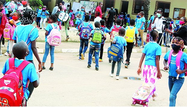 Há muito que a entrada principal da Escola 9020 não ficava apinhada de crianças trajadas de bata branca. Não são poucos os encarregados de educação que acompanharam os filhos até à porta da oficina do saber. Um caos estendeu-se ao longo do asfalto ao lado. Alunos atravessam em diferentes pontos por falta de uma passageira. O trânsito anda e pára. Ao fundo, há recipientes para a higienização das mãos. Os alunos da primeira a quinta classe retornam às aulas onze meses depois, devido à Covid-19 que afecta o mundo.